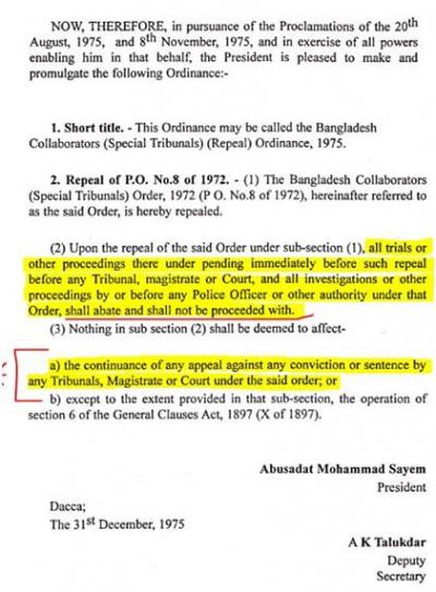 ৩য় উপ-অনুচ্ছেদের প্রথম অংশ অর্থাৎ 'ক'-তে বলা হয়েছে- যারা দালাল আইনে ইতোমধ্যে দন্ডিত হয়েছে এবং বিভিন্ন পর্যায়ে আপিল করেছে, তাদের ক্ষেত্রে এই বাতিল অধ্যাদেশ প্রযোজ্য হবে না।