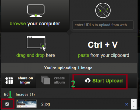 এবার নিচের ছবির মত একটি পপ-আপ ইউন্ডো আসবে। নিচের ১ নম্বর বক্সে দেখানো বক্সটি ক্লিক করে টিক মার্ক করে, দুই নাম্বার বক্সের স্টার্ট আপলোড -এ ক্লিক করুন।