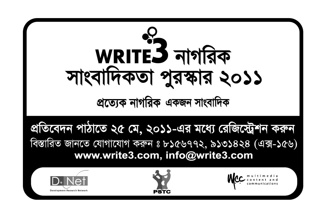write3 নাগরিক সাংবাদিকতা পুরস্কার ২০১১-এর প্রতিবেদন পাঠানোর সময় বাড়লো ৩০ জুন ২০১১ পর্যন্ত