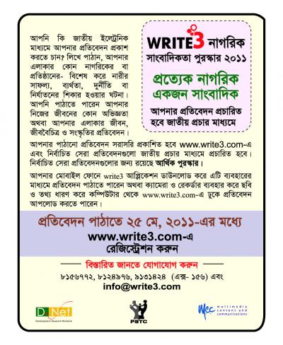 আপনারা জানেন যে, সংবাদ ও সাংবাদিকতা জগতে নাগরিক সাংবাদিকতা একটি গুরুত্বপূর্ণ বিষয়। যা আমাদের এই তথ্য-প্রযুক্তির সময়ে আরো বেশী গুরুত্বপূর্ণ বিষয় হয়ে উঠা প্রয়োজন। নাগরিক সাংবাদিকতা ধারণাটা ব্যাপকভাবে মানুষের মাঝে ছড়ানো গেলে আমরা সমাজ থেকে নানাপ্রকার অসঙ্গতি দূর করতে পারি। নাগরিক সাংবাদিকতা দুর্নীতি কমাতে ও জনগণের অধিকার বাস্তবায়নে বড় রকমে ভূমিকা পালন করতে পারে। সেই লক্ষ্য-উদ্দেশ্যকে সামনে রেখে ডিনেট (D.Net), পিএসটিসি (PSTC) ও এমসিসি’র (MCC) যৌথ উদ্যোগে “write3 নাগরিক সাংবাদিকতা পুরস্কার ২০১১”-প্রতিযোগিতার আয়োজন করেছে।