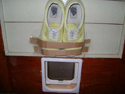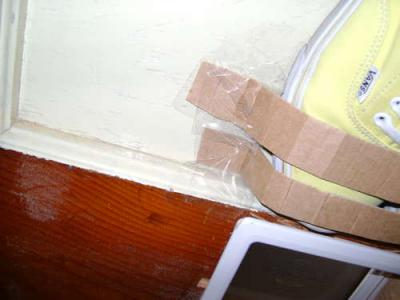 কাগজের টুকরো দুটি দরজার সাথে স্কচটেপ দিয়ে ছবির মত করে এমনভাবে শক্ত করে লাগাতে হবে যাতে এর মাঝে জুতা/স্যান্ডেল রাখা যায়।