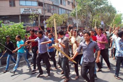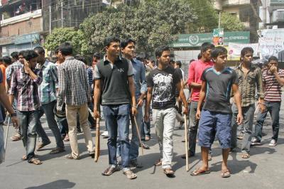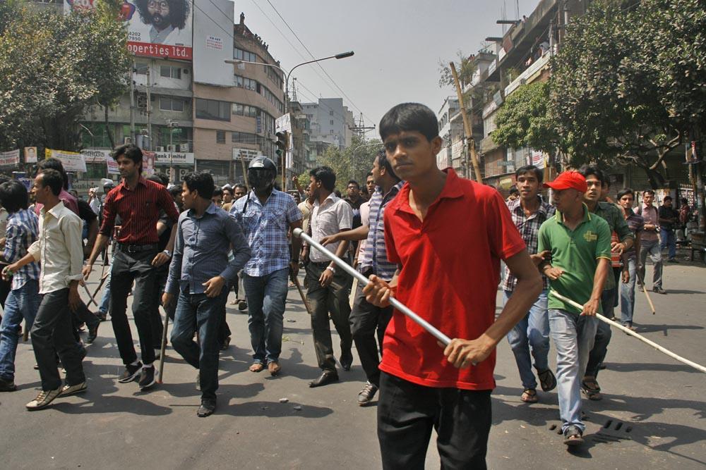 মৎসভবন মোড়ে বেলা সাড়ে ১২টায় পুলিশের সামনেই দা, লাঠি নিয়ে অবস্থান নেয় ছাত্রলীগের কর্মীরা।
