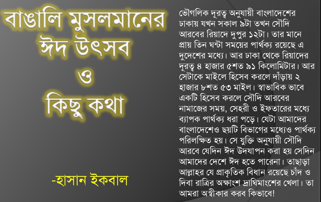 ভৌগলিক দূরত্ব অনুযায়ী বাংলাদেশের ঢাকায় যখন সকাল ৯টা তখন সৌদি আরবের রিয়াদে দুপুর ১২টা। তার মানে প্রায় তিন ঘন্টা সময়ের পার্থক্য রয়েছে এ দুদেশের মধ্যে। আর ঢাকা থেকে রিয়াদের দূরত্ব ৪ হাজার ৫শত ৯১ কিলোমিটার। আর সেটাকে মাইলে হিসেব করলে দাঁড়ায় ২ হাজার ৮শত ৫৩ মাইল। স্বাভাবিক ভাবে একটি হিসেব করলে সৌদি আরবের নামাজের সময়, সেহরী ও ইফতারের মধ্যে ব্যাপক পার্থক্য ধরা পড়ে। যেটা আমাদের বাংলাদেশেও ছয়টি বিভাগের মধ্যেও পার্থক্য পরিলক্ষিত হয়। সে যুক্তি অনুযায়ী সৌদি আরবে যেদিন ঈদ উদযাপন করা হয় সেদিন আমাদের দেশে ঈদ হতে পারেনা। তাছাড়া আল্লাহর যে প্রাকৃতিক বিধান রয়েছে চাঁদ ও দিবা রাত্রির অক্ষাংশ দ্রাঘিমাংশের খেলা। তা আমরা অস্বীকার করব কিভাবে!