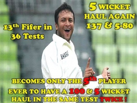 সেঞ্চুরি ও ইনিংসে পাঁচ উইকেট একাধিকবার নেওয়ার কৃতিত্ব এর আগে ছিল মাত্র চারজনের। সোবার্স, মুশতাক, বোথাম ও ক্যালিসের। আজ এই সংক্ষিপ্ত তালিকায় ঢুকে পড়লেন সাকিব। এর আগে ২০১১ সালের ডিসেম্বরে মিরপুর টেস্টে পাকিস্তানের বিপক্ষে ১৪৪ রান করার পাশাপাশি ৮২ রানে ৬ উইকেটও নিয়েছিলেন। চলতি খুলনা টেস্টে ব্যাট হাতে ১৩৭ রান করা সাকিব বল হাতে ৮০ রানে নিলেন পাঁচ উইকেট।