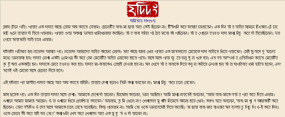আমাদের জীবনে চলার পথে কত ঘটনাই না ঘটে ৷ কোনোটা ভাল, কোনোটা মন্দ আবার কোনোটা শুধুই ঘটনা ৷ গত সপ্তাহের দুটি ঘটনা কেন জানিনা আমার ভেতরটা সামান্য ছুঁয়ে গেছে ৷ সেইটাই ব্লগের বন্ধুদের সাথে শেয়ার করতে চাই ৷ আমি থাকি ব্যাঙ্গালোর শহরের উত্তর প্রান্তে বড় রাস্তা থেকে অনেকটা ভেতর দিকে... বাকিটুকু পড়ুন