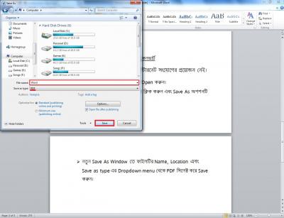 ► নতুন Save As Window তে ফাইলটির Name, Location এবং Save as type এর Dropdown menu থেকে PDF সিলেক্ট করে Save করুন।