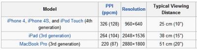 আইপ্যাড এবং ম্যাক বুক-প্রোর PPI ৩০০-এর কম হলেও এ্যপল রেটিনা ডিসপ্লে বলছে কারন হাই রেজু্লেশনের কারণে টিপিক্যাল ভিউইং দূরত্বে ইমেজ কোয়ালিটি আইফোনের মতই।