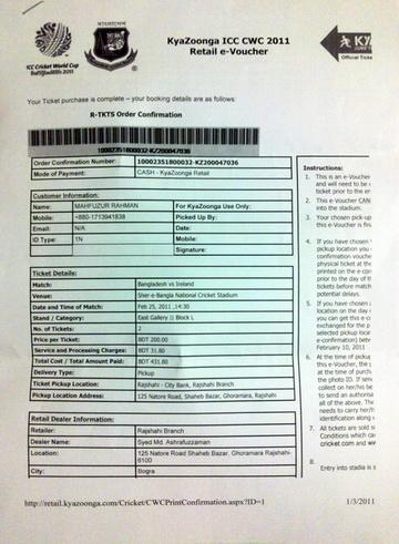 ।। আমরা মোট ৬ জন বন্ধু,৩ জন টিকেট কাটতে গিয়ে প্রত্যেকে ২ টি করে মোট ৬ টা টিকেট পেলাম।। বাংলাদেশের সাথে ওয়েস্টিন্ডিজ,ভারত ও দক্ষিন আফ্রিকার খেলার টিকেট শেষ হওয়ায় আয়ারল্যান্ডের সাথের খেলার টিকেট কাটতে বাদ্ধ হলাম।। এই মুহুর্তে খুব ভালো লাগছে।। ভাবছি বিশ্বকাপে বাংলাদেশ আয়ারল্যান্ডের কাছে ২ বারই পরাজীতো হয়েছে,এই বার আমরা উপস্থিত থেকে তাদের হারাবো