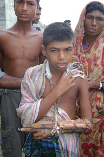 সেই ভয়াল রাতে ঘড়ের খুটি গায়ের উপর পড়লে বা হাত ভেংগে যায় এই কিশোর ছেলেটির। তারপর ১ মাস যাবত কোন প্রকার চিকিৎসা ছাড়াই শুধু কাঠি বেধে রাখা হয়েছে। নদী পার হয়ে শহরে যেয়ে যে চিকিৎসা করাবে সামান্য সে টাকা টুকুও নেই। আর গত ১মাস এ সেখানে আমরা বাদে আর কোনো রিলিফ দল বা চিকিৎসা দল ও যায়নি।