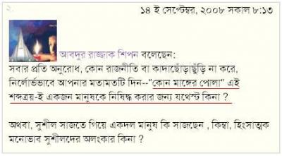 রাসেলের গালাগালিরে একজন মহান প্রমানে ব্যাস্ত। রাসেল নাকি মাঙ্গের পো কইয়া খারাপ কিছু কয় নাই। তো আমি গিয়া কইলাম, ঠিকাসে তুমি একেটা মাঙ্গের পো। এই কথা কওনে আমার মন্তব্যের উপর অবরোধ আরোপ করসে। আমি মন্তব্য করলে সেইটা মডারেশনে চইলা যায়। ব্লগবাসী, এইটারেই ভন্ডামী কয়?