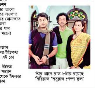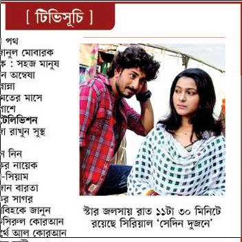 এক সাথে প্রথম আলো, নয়া দিগন্ত আর কালের কণ্ঠ নিয়া বসলাম। ফন্ট জামেলায় পড়ে নয়া দিগন্ত পড়া বাদ দিলাম(আমার ......!! প্রত্রিকা, এমন এক ফন্ট ইউজ করে যে কোন ভাবেই দেখতে পারলাম না) যাক প্রথম আলো আর কালের কন্ঠ পড়ছি।খবরের হেডলাইন গুলো পরছি আর পাতা উল্টাচ্ছি। খালেদার বিরুদ্বে মামলা, তারেকের মামলার শুনানি, মিলন হত্যায় পুলিশের হাত...............এইসব। প্রত্রিকায় বিনোদনের পাতাটা খুব একটা খোলা হয় না কখনোই। তার উপর টিভিসূচি দেখার তো প্রশ্নই আসে না, ( কখন কি অনুষ্ঠান দিচ্ছে তা দিনে কয়েক বার করে টি.ভি. তেই প্রচার করে চ্যানেল কর্তৃপক্ষ)!! আজ হঠাৎ করে বিনোদনের পাতা খুলে বসলাম। সেলিম আল দিন স্মরনে, আফজাল হোসেনের সাক্ষাৎকার, লেডি গগার কপি-পেষ্ট..... ....... এইসব। কালের কন্ঠের পাতার নিছের দিকে চোখ পড়লো। টি.ভি. সূচীর পাশে আজকের হাইলাইস করা ছবি দুটোর দিকে তাকালাম। আমিতো পুরোই তাজ্জব বনে গেলাম!! এদের হাইলাইট করা ছবিদুটো ই দুটো হিন্দি বস্তাপঁচা সিরিয়ালের !!