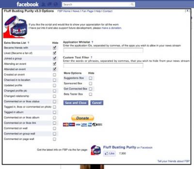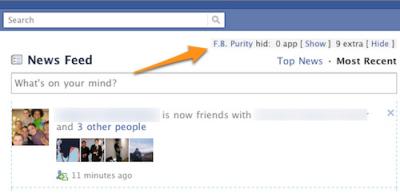 আপনার একটিভ ফ্রেন্ড এর সংখ্যা যদি বেশি হয় তাহলে দেখবেন আপনার হোম পেজে News Feed হিসেবে পাবেন অনেক links, status messages, photo albums, game requests, spammy apps, likes, group discussions। আপনি ইচ্ছা করলে এই News Feed হিসেবে কি দেখাবে তা কন্ট্রোল করতে পারেন। এজন্য একটি extension ব্যবহার করতে হয় যার নাম F.B. Purity । এটা ইনস্টল করে নিন। নিচের চিএ দেখুন