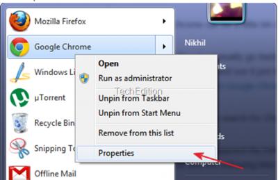 ১। chrome icon এর ডান বাটন ক্লিক করে Properties. সিলেক্ট করুন।