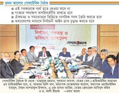 গতকাল শনিবার প্রথম আলো আয়োজিত ১১ জানুয়ারিঃ নির্বাচন, গণতন্ত্র ও ভবিষ্যৎ বাংলাদেশ শীর্ষক গোলটেবিল বৈঠকে অংশগ্রহণকারীরা এসব কথা বলেন। প্রথম আলো কার্যালয়ে অনুষ্ঠিত এ বৈঠকে উপস্থিত ছিলেন বিশিষ্ট অর্থনীতিবিদ অধ্যাপক মোজাফ্ফর আহমদ, তত্ত্বাবধায়ক সরকারের সাবেক চার উপদেষ্টা ড• আকবর আলি খান, অধ্যাপক ওয়াহিদউদ্দিন মাহমুদ, এম হাফিজউদ্দিন খান ও সুলতানা কামাল, বিএনপির অস্থায়ী মহাসচিব মেজর (অব•) হাফিজউদ্দিন আহাম্মদ, আওয়ামী লীগের ভারপ্রাপ্ত সাধারণ সম্পাদক সৈয়দ আশরাফুল ইসলাম, সাবেক অ্যাটর্নি জেনারেল এ এফ হাসান আরিফ, রাষ্ট্রপতির সামরিক সচিব মেজর জেনারেল আমিনুল করিম, ইন্টারন্যাশনাল চেম্বার অ্যান্ড কমার্স, বাংলাদেশের (আইসিসিবি) সভাপতি ব্যবসায়ী মাহবুবুর রহমান এবং যুক্তরাষ্ট্রের ইলিনয় স্টেট ইউনিভার্সিটির রাজনীতি ও সরকার বিভাগের চেয়ারপারসন অধ্যাপক আলী রীয়াজ। গোলটেবিল বৈঠক পরিচালনা করেন প্রথম আলো সম্পাদক মতিউর রহমান। (অসমাপ্ত)