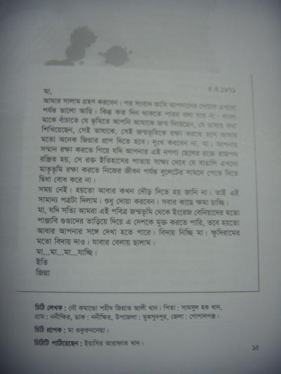 সময় নেই। হয়তো আবার কখন দৌড় দিতে হয় জানি না। তাই এই সামান্য পত্রটা দিলাম। শুধু দোয়া করবেন। সবার কাছে ক্ষমা চাচ্ছি। মা, যদি সত্যি আমরা এই পবিত্র জন্মভুমি থেকে ইংরেজ বেনিয়াদের মতো পাঞ্জাবি গুণ্ডাদের তাড়িয়ে দিয়ে এ দেশকে মুক্ত করতে পারি, তবে হয়তো আবার আপনার সাথে দেখা হতে পারে। বিদায় নিচ্ছি মা। ক্ষুদিরামের মতো বিদায় দাও। যাবার বেলায় ছালাম।