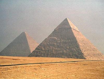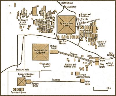 GHIZA - The plateau of Ghiza, just a few kilometres south-west of central Cairo, is on the edge of the desert but within a stones throw of 'modern' habitation. The pyramids totally dominate the surrounding area by their extraordinary size.