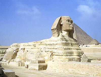 The Great Sphinx with Cheops the largest of the Pyramids in the background