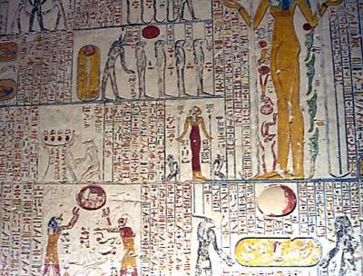 A small part of the brightly coloured murals in one of the tombs in The Valley of the Kings