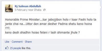 এবার দেখুন ৫ ফেব্রুয়ারি কাদের মোল্লার ফাঁসির রায়ের পর তার স্ট্যাটাস: