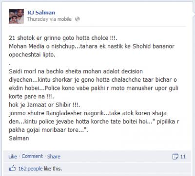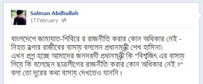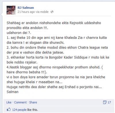 "আমি সালমানের অনেক বড় ফ্যান। কিন্তু একজন মানুষ যদি তার জনপ্রিয়তাকে কাজে লাগিয়ে দেশদ্রোহীতা করে আর তার অনুসারীদের মধ্যে তা প্রমোট করে, তবে তার ফ্যান কীভাবে হবো? ভালো ছাত্র আর ভাল মানুষের মধ্যে তফাৎ অনেক। মাঝে মাঝে চিন্তা করে খারাপ লাগে, এরা ঢাকা বিশ্ববিদ্যালয়ে পড়ে কোন যোগ্যতায়? কেবলমাত্র মেধাবী বলে? শুধুমাত্র মেধাই কি একজন মানুষের মানবিকতা ও জাতীয়তাবাদ মাপের মাপকাঠি হতে পারে? ঘৃণা জানাই এ সব নব্য রাজাকার সেলিব্রেটিদের।"