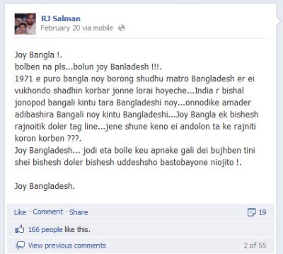 ২০ ফেব্রুয়ারি, মুক্তিযুদ্ধের "জয় বাংলা" স্লোগান নিয়ে তার আপত্তি বিষয়ক স্ট্যাটাস। যখন শাহবাগে লাখ লাখ মানুষ আওয়ামীলীগের কাছ থেকে "জয় বাংলা" স্লোগান কেড়ে নিয়ে এখন নিজেদের চেতনাকে খুঁজে পাচ্ছে আর আওয়ামীলীগকে ধিক্কার দিচ্ছে এটাকে রাজনৈতিক উদ্দেশ্যে ব্যবহারের জন্য, সেখানে এই তথাকথিত সেলিব্রেটির "আপত্তি" টা বুঝে নিন।