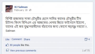 কিন্তু উপরে দেখুন তার স্ট্যাটাসে তার অন্য এক ফ্যানের মন্তব্য: "এতদিন জানতাম মানুষের একটা মুখ, এখন দেখতেসি সালমানের দুইটা মুখ। এতদিন এক রূপ দেখেছি, এখন অন্য রূপ!"