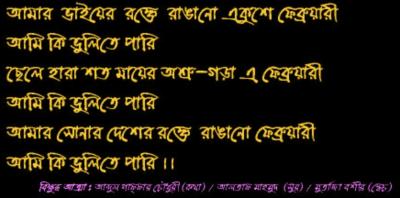 ওই ভাষা আন্দোলনের পথ ধরে সংগ্রাম এগিয়ে চলে এবং নানা সংগ্রাম আন্দোলনের পথ ধরে ধীরে ধীরে একাত্তর। মুক্তিযুক্ত, স্বাধীনতা সংগ্রাম। স্বাধীন রাষ্ট্র বাংলাদেশ। রাষ্ট্রভাষা বাংলা। তারও পর ২০০০ সাল। জাতিসংঘ ঘোষণা করল অমর ওই একুশ ফেব্রুয়ারি হবে আন্তর্জাতিক মাতৃভাষা দিবস। একুশের চেতনা, প্রেরণা বাংলাদেশ ছাপিয়ে ছড়িয়ে পড়ল জগতময়।
