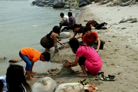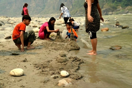নেপালীদের যে কোনো উৎসবের প্রধান করনিয় মন্দির দর্শন। সে দিন আর কোনো মন্দিরে ঠাঁই নাই। মন্দিরে এসে চোখে পড়লো বিশাল লাইন। ছোট ছেলেকে নামিয়ে দিলাম, লাইনে দাঁড়াবার জন্য। আমরা গাড়িতে এগিয়ে যাচ্ছিতো, যাচ্ছিই। লাইন আর শেষ হয় না। কয়েক হাজার মানুষের লাইন। শেষে সিদ্ধান্ত হলো মূল মন্দিরে আর যাব না। টেলিফোনে ছেলেকে ডেকে আনা হলো। পাশেই সুন্দর পাহাড়ী নদী, সেখানে পানিতে কয়েকটা ছবি তুললো ছেলেরা। অনেক বাচ্চারা নদীর পাড়ে খেলছে, নদীর ভেজা বালি দিয়ে মন্দির বানাচ্ছে।