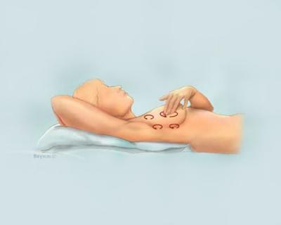 ক)ডান কাঁধের নীচে বালিশ এবং মাথার নীচে ডান বাহু রাখতে হবে। বাম হাতে সব আঙ্গুল একসঙ্গে মেলে অগ্রভাগ দিয়ে আস্তে আস্তে চাপ দিয়ে ছোট চোঠ চক্রাকারে পরীক্ষা করুন।