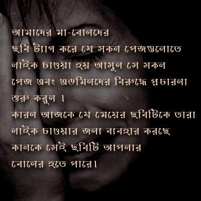 আজকে ফেসবুকের পেজগুলাতে যেই মেয়ের ছবি ব্যবহার করে লাইক চাওয়া হচ্ছে । কালকে সেখানে আপনার বা আমার পরিবারের কারো ছবি দেওয়া হতে পারে । আসুন সবাই মিলে এই সব পেজ গুলোর বিরুদ্ধে দাড়াই ।