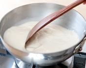 (১) কর্ণ ফ্লাওয়ার, লবণ এবং ১/২ কাপ পানি একসাথে মিশিয়ে নিন। বাকি এক কাপ পানি ফুটিয়ে এক পাশে রাখুন। একটি ফ্রাইপ্যানে তিলের পেস্ট রাখুন এবং ধীরে ধীরে কর্ণ ফ্লাওয়ারের মিশ্রণ যোগ করুন। খেয়াল রাখবেন, যোগ করার সময় একবারে ১ টেবিল-চামচ করে যোগ করতে হবে। প্রতিবার যোগ করার পর ভালভাবে মিশিয়ে নিন। ৩ / ৪ চামচ মেশানোর পরে আরো একটু বেশি পরিমাণে মেশাতে পারেন। যখন প্রায় অর্ধেক তিলের পেস্ট যোগ করা হয়ে যাবে তখন বাকিটা একবারে মিশিয়ে দিতে পারেন। পুরোটা মেশানোর পরে ভালভাবে নেড়ে দিন। তারপর ধীরে ধীরে রেখে দেয়া এক কাপ গরম পানি একটু একটু করে যোগ করে নাড়তে থাকুন।