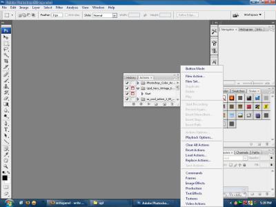 যেই ছবিটাতে এফেক্ট দিতে হবে সেটা ওপেন করুন। তারপর ডানপাশের উইন্ডোগুলোতে দেখেন actions উইন্ডো পাওয়া যায় কিনা। না গেলে উপরের মেনু টুলবার থেকে windows>action সিলেক্ট করুন। দেখুন ডান পাশে history এর পাশে action নামে একটা ট্যাব আছে। ট্যাবের কোণায় নিচের ছবির মতো করে লেফট ক্লিক করলে মেনু আসবে।