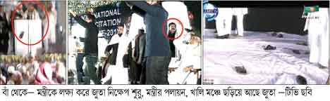 সিলেট কেন্দ্রীয় শহীদ মিনারে যুদ্ধাপরাধীদের ফাঁসির দাবির আন্দোলনে সংহতি প্রকাশ করতে এসে জুতা প্রদর্শনের শিকার হলেন দফতরবিহীন মন্ত্রী সুরঞ্জিত সেন গুপ্ত।