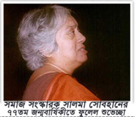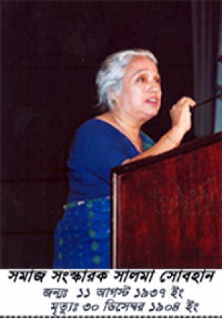 সমাজসেবী, জনদরদি অথচ ভীষণভাবে নিভৃতচারী মানুষ সালমা সোবহান ২০০৩ সালের ৩০ ডিসেম্বর মধ্যরাতে হৃদযন্ত্রের ক্রিয়া বন্ধ হয়ে মাত্র ৬৬ বছর বয়সে তার পার্থিব জগতের বন্ধন ছিন্ন করে পাড়ি জমায় অজানা এক জগতের উদ্দেশে। ওই দিন তার শারীরিক মৃত্যু হলেও দেশের নারী অধিকার ও সুযোগ-সুবিধা বঞ্চিত মানুষের অধিকার প্রতিষ্ঠায় তাঁর অবদান মানবাধিকার সংগঠনগুলো তথা সচেতন নাগরিক সমাজ স্মরণ করে যাবে যুগের পর যুগ ধরে। আজ এই মহিয়সী নারীর ৭৭তম জন্মবার্ষিকী। মানবাধিকার আন্দোলনের পথিকৃৎ সালমা সোবহানের জন্ম দিনে ফুলেল শুভেচ্ছা।