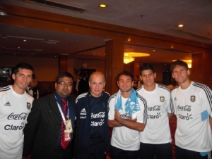 অবশেষে দেড়টার সময় না খেয়েই স্টেডিয়ামে দে ছুট! সবকিছুর ব্যবস্থা করে এসে দেখি আর্জেন্টিনা দলও খেয়ে দেয়ে হোটেলের এগারো তলায় টীম মিটিং এ ব্যস্ত। আবার ৩টার সময় খবর এলো এখনই তাদের লাগেজ ম্যানরা লাগেজ নিয়ে স্টেডিয়ামে চলে যাবে। তাদের সাথে আমিও গেলাম। যথাসময়েই আমরা স্টেডিয়ামে হাজির। কীভাবে তারা ড্রেসিংরুম রেডি করে, তা না দেখলে বোঝা সম্ভব নয়। তাদের লাগেজ আনতে পুরো একটি কভার্ড ভ্যান লেগেছে, শুধু এটা শুনেই আপনারা খানিকটা আন্দাজ করতে পারবেন। প্রত্যেক খেলোয়াড়ের জন্য ৩সেট জার্সি, ২জোড়া বুট, শেভিং কীটস, বডি স্প্রে, পারফিউম, চুইংগাম আরও কত কিছু যে রেডি করা থাকে। ড্রেসিং রুমে ওয়্যারলেস স্পীকারে সর্বক্ষণ গানও বাজতে থাকে। অবশেষে মেসিরা স্টেডিয়ামে এলেন। দল চলে আসার পর অবশ্য ড্রেসিং রুমে বাহিরের কারও ঢোকার অনুমতি নেই। তাই ওদের ডেলিগেটদের ভিভিআইপিতে বসিয়ে দিয়ে আমি চলে আসলাম ডাগ আউটের পাশে। যথাসময়ে খেলা শুরু হলো। সবকিছুই কেমন যেন স্বপ্নের মত লাগছিলো। আর্জেন্টিনা দলের ডাগ আইউটের পাশে দাঁড়িয়ে আছি আমি!!!! সব সময় টিভিতে যা দেখেছি, ঠিক সেভাবে হাতে কাগজ কলম নিয়ে গবেষণা করছেন কোচ ও তার স্টাফরা, গোল হলে খেলোয়ারদের সাথে ডাগ আউটেও উল্লাস!! সব কিছুরই সাক্ষী ছিলাম আমি! মাঠে দাঁড়িয়ে দেখলাম মেসি ম্যাজিক, দেখলাম আমার প্রাণের দল আর্জেন্টিনার জয়। খেলা শেষে দলের সাথেই পৌঁছে গেলাম হোটেলে। খেলোয়াড়েরা সবাই সরাসরি খেতে চলে গেলো। আর আমার দায়িত্ব পড়লো তাদের সমস্ত লাগেজ এয়ারপোর্টে পাঠানোর ব্যবস্থা করার।