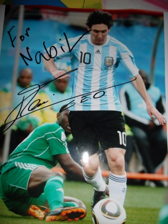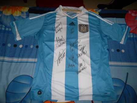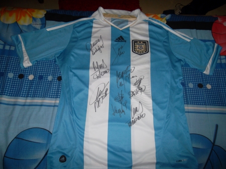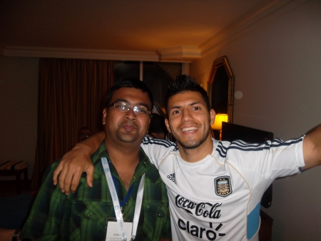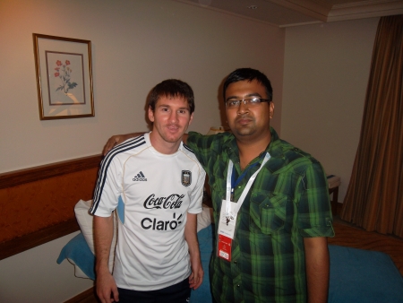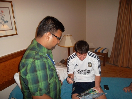 সব কাজ শেষ করে বসে আছি হোটেলের লবিতে, আর্জেন্টিনার চলে যাওয়ার অপেক্ষায়। রাত তখন সাড়ে এগারোটার মত। হঠাৎ করেই রড্রিগো আর পার্নেস এসে হাজির। আমাকে ডেকে বলল, “আমাদের সাথে একটু আসো, দরকার আছে।“ ভাবলাম, আবার কোন নতুন কাজ ধরিয়ে দিবে হয়তো! কিন্তু না!! তারা আমাকে সরাসরি নিয়ে গেলো ১০তলায়, ১০০৮নং রুমে! ঢুকে দেখি রুমে আয়েশী ভঙ্গিতে শুয়ে আছেন আধুনিক ফুটবলের অবতার!! ফুটবলকে অন্যগ্রহের রূপ দেওয়া লিওনেল মেসি স্বয়ং!!! আমাকে ঢুক্তে দেখে নিজেই উঠে দাঁড়িয়ে হাত বাড়ালেন। হাত মেলানো শেষে নিজেই পাশে বসতেও বললেন। এত বড় একজন মানুষ, যাকে এক পলক দেখার জন্য সমগ্র বিশ্বের মানুষ ব্যাকুল হয়ে থাকে, তার কাছ থেকে এমন ব্যবহার পেয়ে আমি রীতিমত অভিভূত!!! উত্তেজনায় আমার শরীর তখন রীতিমত কাঁপছে! পার্নেস আমাকে বলল, “তুমি এই কয়দিন আমাদের জন্য যেভাবে পরিশ্রম করেছো, তা সত্যিই অবিশ্বাস্য! তোমার এই পরিশ্রমের কথা মেসিও জানে। তার প্রতি তোমার অন্ধ ভক্তর কথা শুনে সেই তোমাকে ডেকে পাঠিয়েছে!!” শুনে মনে হল এখনই অজ্ঞান হয়ে পড়ে যাবো! কোন মতে পকেটে থাকা ক্যামেরা রড্রিগোর হাতে দিয়ে বললাম ছবি তুলে দিতে। আর মেসির দিকে অটোগ্রাফের জন্য বাড়িয়ে দিলাম সাথে থাকা একটি ছবি। ছবি হাতে নিয়ে মেসি বলল আগে সেখানে আমার নাম লিখতে। লিখে দেওয়ার পর সেই ছবিতেই তিনি দিলেন তার সেই মহামূল্য অটোগ্রাফ!!! এরপর নিজেই দাঁড়িয়ে আমার সাথে ছবি তুললেন। আমি খুশিতে তাকে স্প্যানিশে বললাম, “TE QUIERO!” যার অর্থ “I LOVE YOU!” এটা শুনে মেসিও হেসে ফেললেন। আর পাশে দাঁড়িয়ে থাকা ম্যারাডোনার জামাতা সার্জিও আগুয়েরো চিৎকার দিয়ে বললেন, “WHY MESSI?? WHY NOT ME?” আমিও তাকে ধরে বললাম, “TE QUIERO TOO!” এটা শুনে সে হাসতে হাসতে বলল, “THEN HAVE A PICTURE WITH ME!” এটা বলে সে নিজেই আমার কাধে হাত দিয়ে ছবি তুলল। এরপর রড্রিগোর সাহায্যে মেসি আর আগুয়েরোকে জিজ্ঞেস করলাম, কোলকাতা আর ঢাকার মাঝে কোথায় বেশি ভালো লেগেছে? অকপটে তারা জানিয়ে দিলো, কোলকাতার চেয়ে ঢাকার আয়োজন ছিল অনেক অনেক বেশী সুন্দর! খুশিতে মনটা ভরে গেলো! গত ২দিনের সব কষ্টই সার্থক মনে হচ্ছিল তখন। অবশেষে তাদের কাছ থেকে বিদায় নিয়ে লিফটের কাছে আসলাম। তখন আমাকে আরও অবাক করে দিয়ে পার্নেস আমার হাতে তুলে দিলেন আর্জেন্টিনা দলের প্রায় সব খেলোয়াড়ের অটোগ্রাফ সম্বলিত একটি জার্সি। বলল, “এটা সমস্ত দলের পক্ষ থেকে তোমার জন্য উপহার। KEEP UP THE GOOD WORK.” একজন মানুষের জীবনে এর চেয়ে বড় প্রাপ্তি আর কী হতে পারে তা আমার জানা নেই। সেই সময়ের অনুভূতি লেখার অনেক চেষ্টা করেও পারলাম না। কেননা সেই ভাষা আমার জানা নেই।