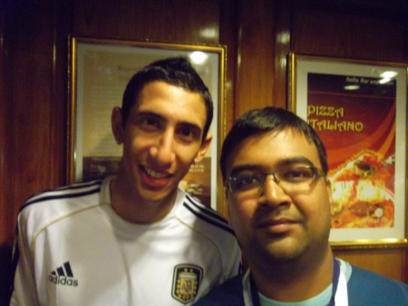 ঘুম ভেঙ্গে গেলো সকাল ৭টায়। সাড়ে ৭টার মাঝেই রেডী হয়ে নিচে নামলাম। নেমে শুনি আরেক যন্ত্রনা। আর্জেন্টিনা দলের খেলোয়াড়েরা দুপুরের আর রাতের খবর পুরা দল একসাথে খেতে নামতো। আবার খাওয়া শেষে একসাথে উপরে যেত, যেন সিকিউরিটি একসাথে সবাইকে গার্ড দিতে পারে। কিন্তু সকালের নাস্তা দলের সবার জন্য বাধ্যতা মূলক না। তাই যার যখন খুশি নাশতা করে যাবে। অগত্যা সাড়ে ১০টা পর্যন্ত ভিন্টেজে বসে থাকা লাগলো। একজন করে যায় আর আসে। এগারোটার সময় ৩জন গেলেন বাফুফে ভবনে ম্যানেজার’স মিটিং এ, ৩জন গেলেন মাঠ পরিদর্শনে আর ৩জন গেলেন শপিং এ। অবশ্য এদের মাঝে কেউই খেলোয়াড় ছিলেন না বলে তেমন কোন সমস্যা হয়নি। সকালটা তাই মোটামোটি শুয়ে বসেই কাটালাম। তবে ঠিক একটার সময় রড্রিগো হাজির তার চাহিদা পত্র নিয়ে। আজ লাগবে ১০০ বোতল করে Gatoride আর পানি। ড্রেসিং রুমে নাকি ম্যাসাজ টেবিল আছে একটা, আরও একটা লাগবে। লাগবে বড় একটা টেবিল, যেটাতে কাগজপত্র ও ল্যাপ্টপ রাখা হবে। তাড়াতাড়ি রুমে গেলাম রেডী হয়ে আসার জন্য। লিফটের জন্য ৯তলায় দাঁড়িয়ে আছি। যেই লিফট খুলল, দেখি ভিতরে অ্যাঙ্গেল ডি মারিয়া!!! আমার খুশি আর দেখে কে! তাড়াতাড়ি পকেটে থাকা ক্যামেরা বের করে একটা ছবি তোলার অনুমতি চাইলাম! মারিয়াও সাথে সাথেই রাজি হয়ে গেলো! কী যে খুশি লাগছিলো তখন, তা বলে বুঝাতে পারবো না!!