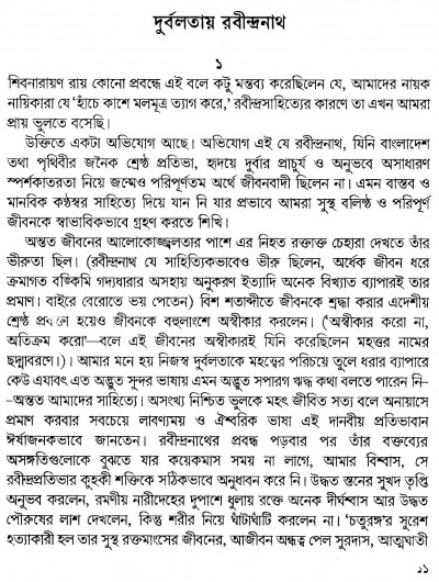 এই সংকলনের প্রথম লেখাটির নাম " দুর্বলতায় রবীনদ্্রনাথ''। রবি ঠাকুরের সাহিত্য এবং তার সম্পর্কিত তাঁর ব্যাক্তিগত নানারকম দুর্বলতা নিয়ে সেমি-রুঢ় আলোচনা করেছেন আব্দুল্লাহ আবু সায়ীদ।