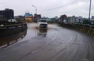 গতকাল ১৬ সেপ্টেম্বর বিকেলে তোলা ছবি এটি। ফ্লাইওভারের উপরে একস্থানে ৪/৫ ইঞ্চি পানি জমে আছে। বৃষ্টি শেষ হযেছে আরও ঘন্টা দুয়েক আগে। ছবিতে দেখা যাচ্ছে ফ্লাইওভারের উপরিভাগ পুরোটাই অত্যন্ত স্যাতস্যাতে। পানি দ্রুত নেমে না গেলে যা হয় আরকি...