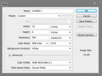 প্রথমে ফটোশপে নিউ ডকুমেন্ট(File>new) খুলতে হবে। যেহেতু জাতীয় পতাকার উপর ভিত্তি করে ওয়ালপেপারটা বানাচ্ছি তাই ক্যানভাস সাইজ ১০''-৬" রেখেছি।