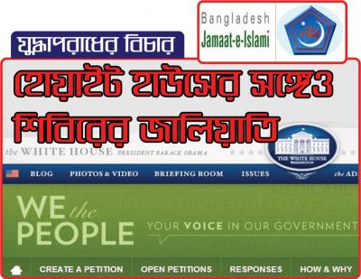 মানবতাবিরোধী অপরাধের বিচার নিয়ে হোয়াইট হাউসের কাছে অভিযোগ তুলে শেষ মুহূর্তে পস্তাতে হলো জামায়াত-শিবিরকে। প্রেসিডেন্ট বারাক ওবামার উদ্দেশে পিটিশন খুলে ডিজিটাল জালিয়াতির মাধ্যমে গত রবিবার পর্যন্ত প্রায় ৮০ হাজার সই প্রদর্শন করতে সক্ষম হয় শিবির।