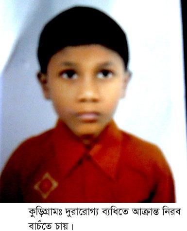 ছোট্র নিবর (৭) পছন্দের রংপেন্সিল গুলো দিয়ে ছরি আকার বইয়ে ঘষে ঘষে রং করে দিনমান। রংয়ের ওপর রং চড়ে হিজিবিজি হয় লাল সবুজের পতাকাটা। সবুজের প্রান্ত ছেড়ে গাঢ় রং ছোটে পুরো পাতায়। তবুও মন ভরে না তার রংয়ে। ভরবেই বা কেমন করে? নিরব যে আর দেখতে পায় না কোন রং। তার চোখে সব রং ঝাপসা হয়ে সাদা কালো দেখা হয়ে দেয়। এভাবে দিনে দিনে অন্ধ হয়ে যাচ্ছে তার চোখ। তার ব্রেইনে পানি জমছে আর চোখের জ্যোতি ক্ষীণ হচ্ছে। এভাবে দ্রুত নিরব মৃত্যুর দিকে এগিয়ে যাচ্ছে। কুড়িগ্রাম কৃষ্ণপুরের অসহায় রাজমিস্ত্রি বাবা সোলজার হোসেন ও মা নুরজাহান বেগম চোখের জল ফেলছে ছেলের দিকে তাকিয়ে। একমাত্র সম্বল ভিটেমাটিটুকু বিক্রির বায়না করে ঢাকার চক্ষু বিশেষজ্ঞ দীন মোহাম্মদের কাছে গিয়েছিলেন। পরীক্ষা- নিরিক্ষা শেষে তিনি দ্রুত শঙ্কর নেত্রালয়ে চিকিৎসা করতে পরামর্শ দিয়েছেন। চিকিৎসায় খরচ লাগবে ২ লক্ষ ৫০ হাজার টাকা । এত টাকা জোগার করার সামর্থ নিরবের বাবা-মায়ের নাই। প্রথম সন্তান পানিতে ডুবে মরে যাওয়া ভুলে গিয়েছিলেন তার বাবা মা নিবরকে পেয়ে। সেই নিরবও কি চলে যাবে অন্ধকারে? ছেলেকে বাঁচাতে তার মা-বাবা সকল বিত্তবান ও সহযোগীদের সহানুভুতি কামনা করেছেন ।