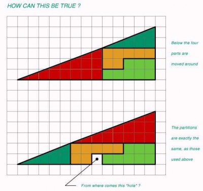 ছবিতে দেখুন, উপরের ত্রিভুজ ও নীচের ত্রিভুজের সাইজ একই। উপরের ত্রিভুজের বিভিন্ন অংশ দিয়ে নীচের ত্রিভুজটা ভরাট করা হলেও একটা ব্লক ফাঁকা থেকে যাচ্ছে............রহস্যটা কোথায়?