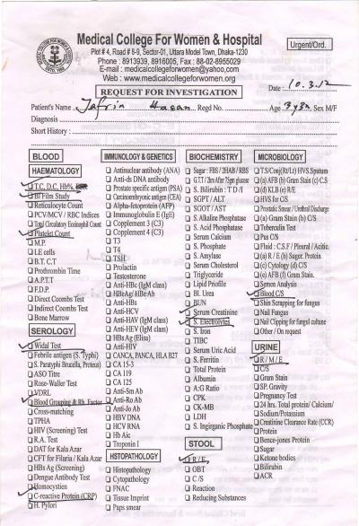 শুক্রবার মাঝরাত থেকে আমার ৩ বয়সী কন্যার জ্বর(১০১-১০২) হয়েছিলো সাথে খুশখুশি কাশি। এক ডাক্তার আত্বীয়ের সাথে ফোনে কথা বললাম। উনি বললেন সিজন চেন্জ হচ্ছে, তাই এমনটা হতে পারে এবং নাপা সিরাপ ১ চামচ খাওয়ানোর পরামর্শ দিলেন। সকাল পর্যন্ত জ্বর কমেনি। সকালে আবার নাপা সিরাপ খাওয়ালাম, তাতেও জ্বরের তেমন উন্নতি হয়নি। শনিবার দুপুরে বাসার কাছেই Medical College for Women & Hospital এ নিয়ে গেলাম। কর্তব্যরত ডাক্তার রোগীর ব্যাপারে বিভিন্ন প্রশ্ন করার পর নিম্নোক্ত টেষ্টগুলো করতে দিলেন।
