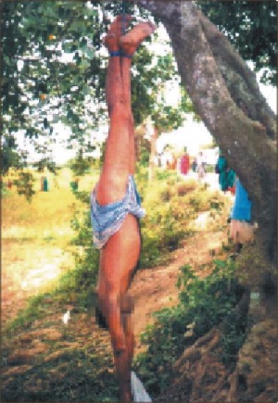 কয়েকদিন ধরে ব্লগে অনেক বেতনভুক ব্লগার তুলে ধরেছেন পলটনের মারপিটের ঘটনা। জামাত শিবিরের অস্ত্রধারী সন্ত্রাসী পিস্তল থেকে গুলি করতে করতে এক পর্যায়ে গুলি শেষ হয়ে গেলে উত্তেজিত জনতার প্রহারে মারা যায়। জনতার প্রহার নতুন কিছু নয়, বাংলাদেশে বেশ কয়েক বছর ধরে আইনশৃঙ্খলতা বাহিনীর নিস্পৃহতার সুযোগে জনতা চোর, ডাকাত, ছিনতাইকারী, রাজাকারকে প্রায়শই পিটিয়ে মারে। যদিও আইন নিজের হাতে তুলে নেয়া কখনই সমর্থন করা যায় না, তবে রক্ত গরমের মব কালচার বাংলাদেশে ব্যপক জনপ্রিয়। জামাতী ব্লগারদের লেখায় যেটা আসে নি তা হলো জামাতীদের ঠান্ডা মাথার খুন। না 71 এর ঘটনা নয়, দুই বছর আগের ঘটনা। "বাংলা ভাই" নামে জামাতের এই নেতা উত্তরের জেলায় ত্রাসের রাজত্ব কায়েম করে। এই ছবিতে বাদশা কে ঝুলন্ত অবস্থায় দেখা যাচ্ছে। বাদশাকে যখন মারা হয়, বাংলা ভাই মাইকে তার গোঙানী গ্রামবাসীদের শোনার ব্যাবস্থা করে দেয়। মধ্যযুগীয় কায়দায় অত্যাচার করে ঠান্ডা মাথায় জামাত সমর্থকরা এসব খুন করে। জামাতের মন্ত্রীরা সহ, জামাত সমর্থকরা একে মিডিয়ার আবিস্কার বলে উড়িয়ে দেয়ার চেষ্টা করে, যদিও কাজ হয় নি। মুল লেখাটি আছে [link|http://www.thedailystar.net/2004/05/21/d4052101011.htm|GLv