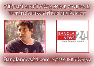 আমাদের দেশের অর্থনৈতিক চাকা সচল রাখার জন্য প্রবাসী ভাইদের অবদান অনস্বীকার্য। গতকাল সৌদি আরবে অগ্নিকান্ডের ঘটনায় মারা গেছেন ১০ জন বাঙ্গালী। আর সেদিনই বাংলানিউজ২৪.কম তাদের পেজের হিট বাড়ানোর জন্যে উদ্দেশ্যমূলক ভাবে প্রবাসী ভাইদের নিয়ে বর্তমান সময়ের সবচেয়ে জনপ্রিয় টিভি অভিনেতা মোশাররফ করিম কে জরিয়ে একটা রিপোর্ট প্রকাশ করেন বাংলানিউজ২৪.কম এর সৌদি আরব করেসপন্ডেন্ট মোহাম্মদ আল আমিন। তিনি শুধুমাত্র একটা পেসবুক পোষ্টকে কেন্দ্র করে একটা নিউজপোর্টালে “ মোশাররফ করিমের শাস্তি দাবি সৌদি প্রবাসীদের “ শিরোনামে রিপোর্ট প্রকাশ করেছেন যে, যা মোশাররফ করিম এবং তার ভক্তদের জন্য অত্যন্ত মানহানিকর। তিনি পোষ্টে একটা ছবিও সংযুক্ত করেছেন যেখানে স্পষ্ট ভাবে মোশাররফ করিমকে মার্ক করে লিখা আছে - তুই ফকিন্নি। তিনি তার রিপোর্টে জানিয়েছেন মোশাররফ করিম অভিনীত “মাইক” নাটক নিয়ে সৌদি প্রবাসী ভাইদের ক্ষোভ প্রকাশের কথা। অথচ এই মাইক নাকট টিভিতে প্রচার হয়েছে আজ থেকে ৪/৫ বৎসর আগে। এতদিন পর কেন এই রিপোর্টারের এই ধরনের প্রতিবাদের মানসিকতা হলো বুঝলাম না। এই নাটকে নাকি সৌদি প্রবাসী ভাইদের অপমান করেছেন মোশাররফ করিম। এই মূর্খ রিপোর্টার ভাই কি জানেন না নাটকের ডায়লগ অভিনেতার ব্যাক্তিগত ইচ্ছার উপর নির্ভর করে না? তাছাড়া যে টিভি কর্তৃপক্ষ সেটা প্রচার করেছেন তারাও সেটা যাচাইয়ের পরই প্রকাশ করেছেন। তাহলে একটা নাটকের ডায়লগের মতো সাধারন ইস্যুকে কেন্দ্র করে গতকাল বাংলানিউজ২৪.কম এর ফেসবুক পেজ এ যে ধরনের বাজে পরিস্থিতি সৃষ্টি হয়েছে তার জন্য দায়ী কে? সেখানে দ্বিমূখী ভাবে কেউ মোশাররফ করিমের মা-বাবা কে ধরে গালাগালি করছে, কেউ সৌদি প্রবাসী সহ সকল প্রবাসী ভাইদের চৌদ্দগুষ্ঠি উদ্ধার করছে। এতে কারা অপমানিত হয়েছে? অপমানিত হয়েছি আমরা বাঙ্গালি রাই। মোশাররফ করিম মাইক নাটকে যেমন অভিনয় করেছেন, তেমনি প্রবাসী ভাইদের জীবন নিয়ে নির্মিত নাটক ’তোমার দোয়ায় ভাল আছি মা’ নাটকেও অভিনয় করেছেন। তাহলে আমরা বেঈমানের মতো এক তরফা ভাবে কিভাবে এমন একজন অভিনেতাকে অপমান করতে পারি? যারা বাংলা নাটক দেখেন তাদের মধ্যে একজন মানুষও কি বুকে হাত দিয়ে বলতে পারবেন যার কাছে মোশাররফ করিমের কোন অভিনয় ভাল লাগেনি? বিষয়টি নিয়ে এতোদিন কোন কথাই হয়নি, কিন্তু নাটকের একটা সাধারন বিষয়কে বাংলানিউজের মতো একটা নিউজপোর্টাল কিভাবে জাতীয় ইস্যুতে দাড় করিয়ে দেয় সেটা আমার বোধগম্য হয়নি। আর সেই ইস্যুতে অনেকেই বলছেন মোশাররফ করিম ইচ্ছে করে এইসব করছে, এইসব বিষয় নিয়ে ইয়ার্কি করা উচিত না, এটা ফাইজামির বিষয় না... আরে মিয়া ভাই কোন পেশা নিয়েই যদি নাটক করা না যায় তাহলে তো দেশে নাটব নানানো বন্ধ করে দিতে হবে.. মোশারর