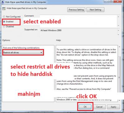 >> তারপর যে উইন্ডোটা আসবে এখান থেকে enabled সিলেক্ট করুন । তারপর restrict all drives সিলেক্ট করুন । নিচের ছবির মতো । এরপর ওকে প্রেস করুন ।