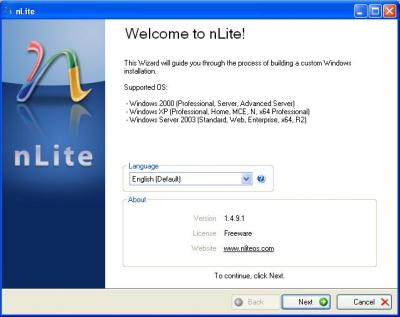 # প্রথমে nLite সফটওয়্যারটি চালু করুন এবং ইংরেজী ভাষা নির্বাচিত রেখে Next বাটনে ক্লিক করুন।