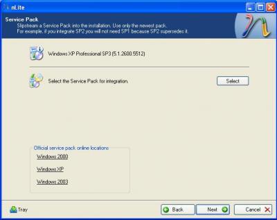 # Service Pack উইন্ডোতে আপনি চাইলে এক্সপির সার্ভিস প্যাক ৩ যুক্ত করতে পারেন Select বাটনে ক্লিক করে। উইন্ডোজ এক্সপির সার্ভিস প্যাকটি দেখিয়ে দিলেই এটি ইন্ট্রিগেট হয়ে যাবে।