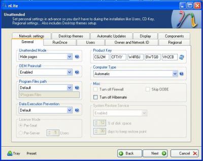 # এরপরে Unattended উইন্ডোর General ট্যাবে গিয়ে Product Key দিন। এটি উইন্ডোজ এক্সপির সিরিয়াল নম্বর।